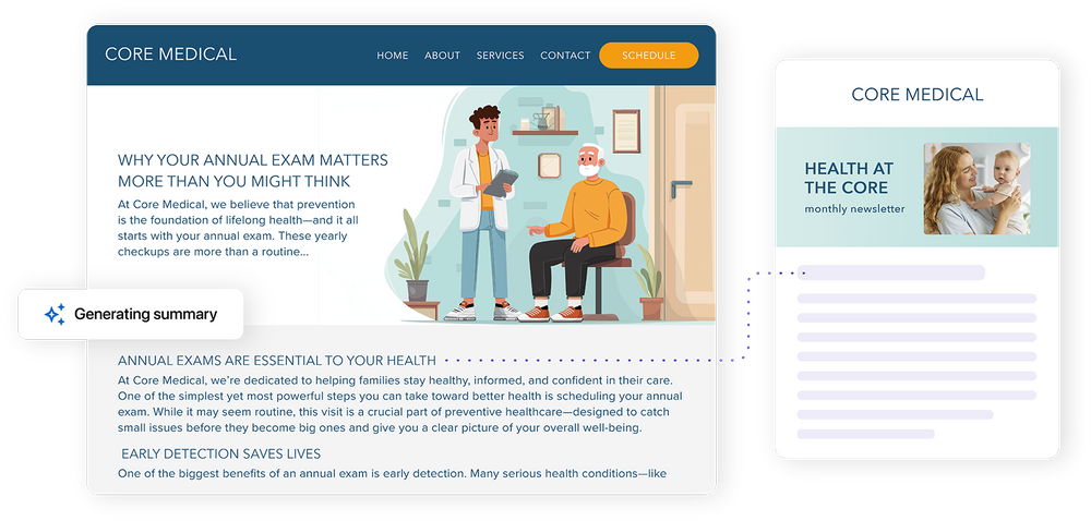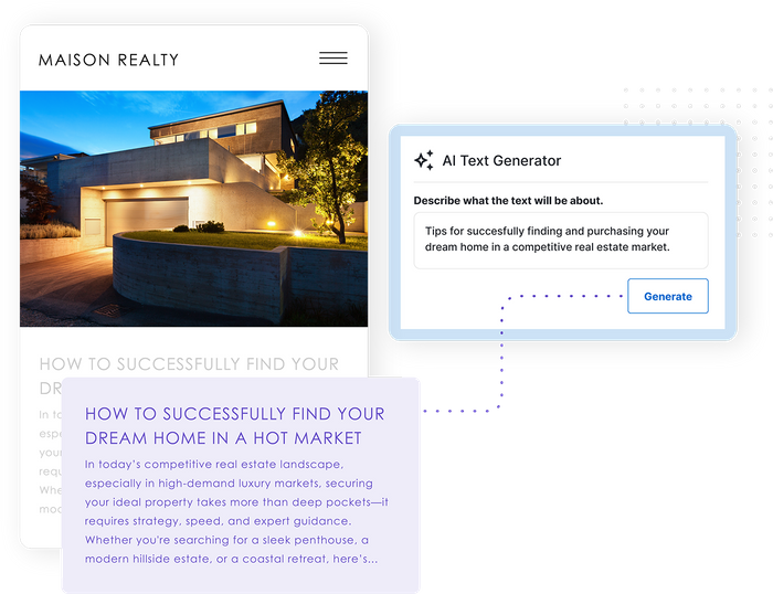 Generate blogs, service pages, FAQs, and more in seconds using built-in AI tools.Provide a few details and our platform will handle generation, refinement, and publishing—without the need for additional apps or headaches.